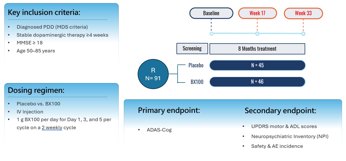 - 2017年向美國FDA申請IND核准,啟動帕金森失智症多中心雙盲二期臨床試驗,2025Q2已進入解盲階段。